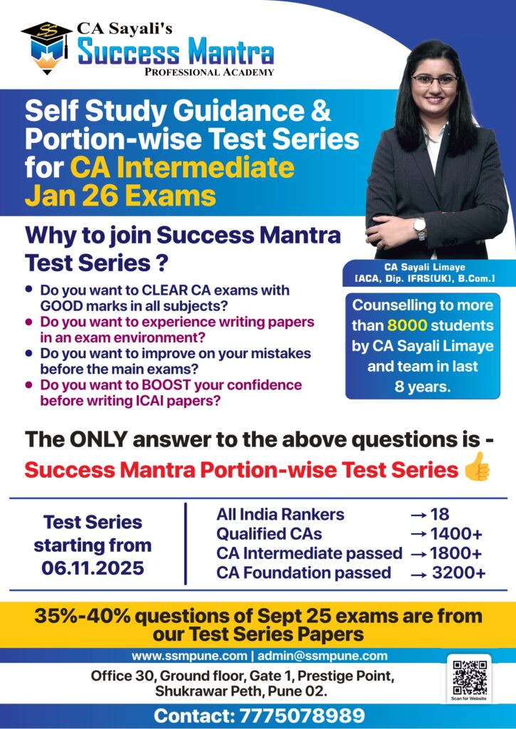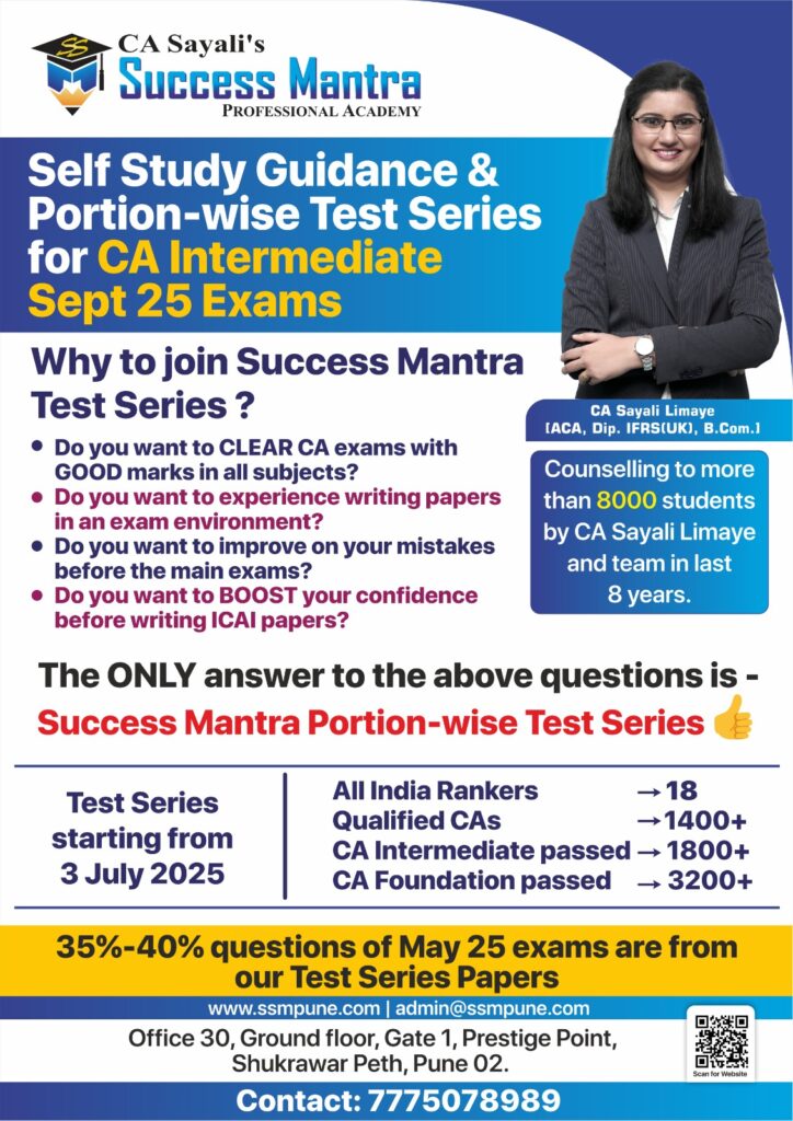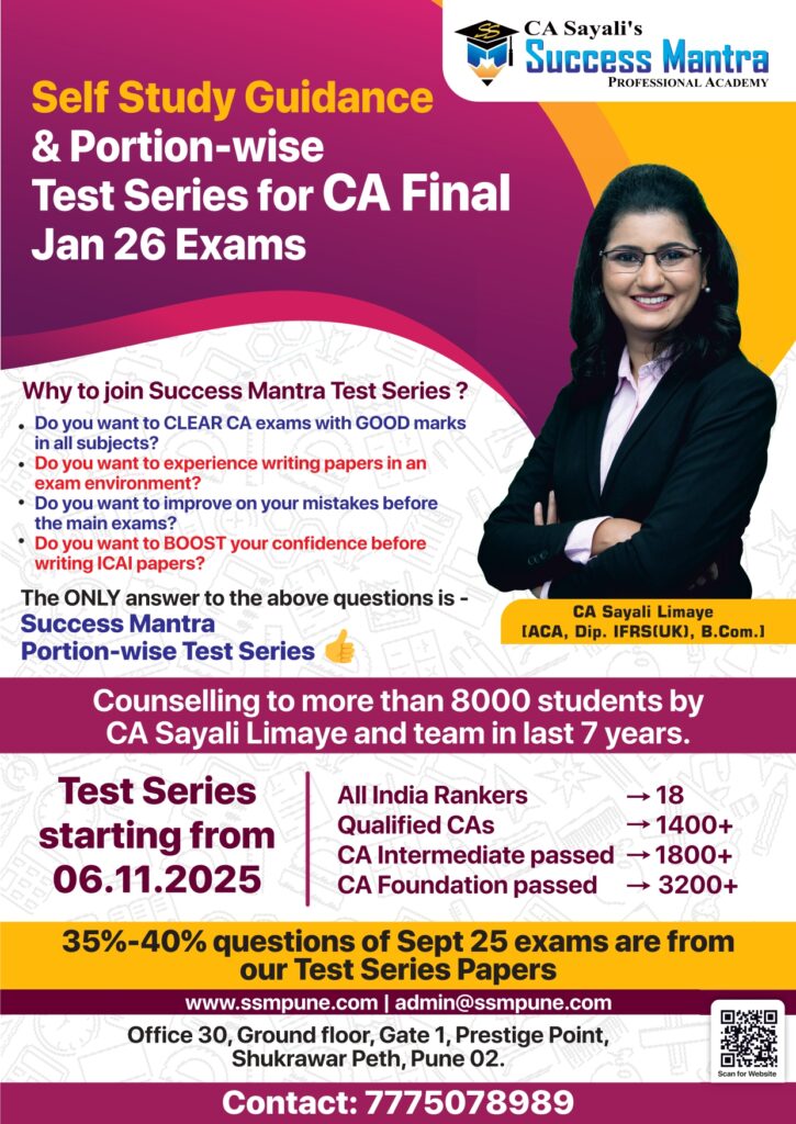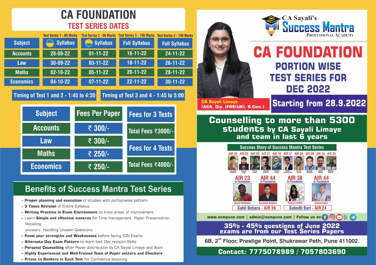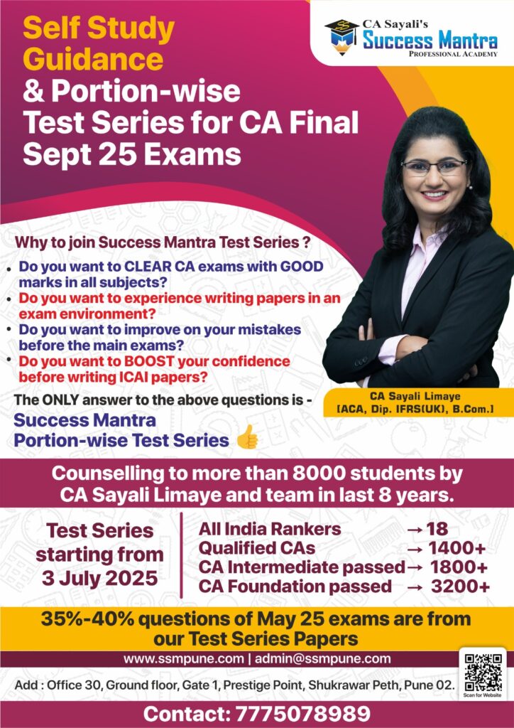 Success mantra's test series is exact 1st hand expirience of CA final exams. It helps to plan your studies in proper way,and checking of papers is also so proper so that you will get an idea where you stand before final exam itself. Also Sayali mam and other staff helps to resolve queries through whtsapp 😊 100% recommendable to go for these test series at any level of CA course.