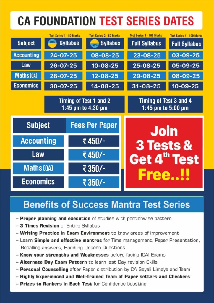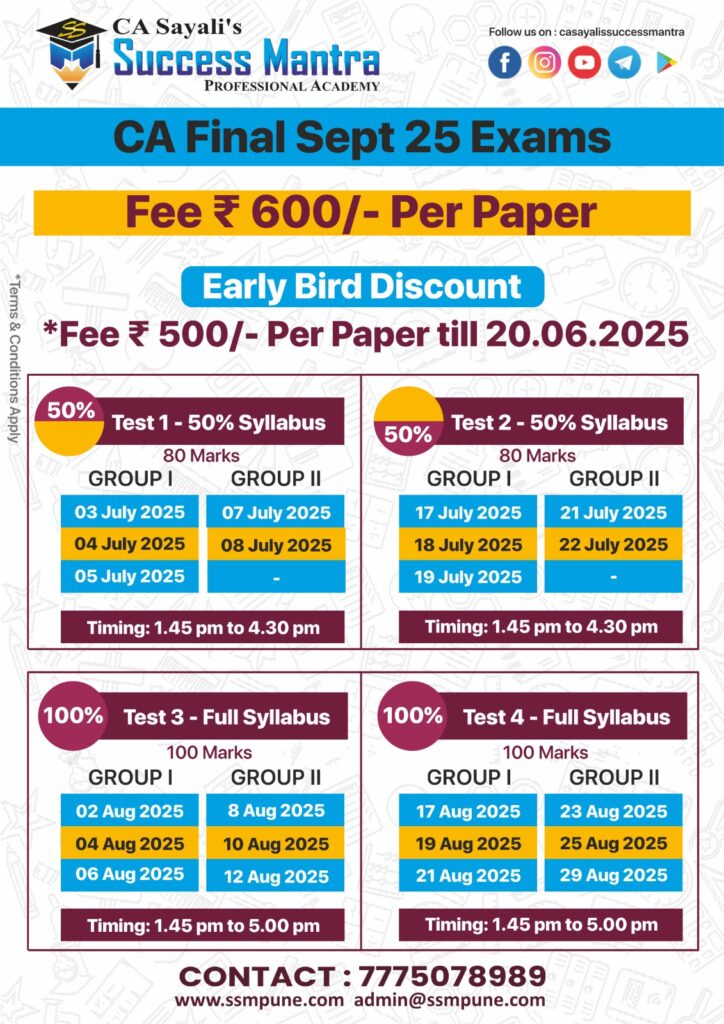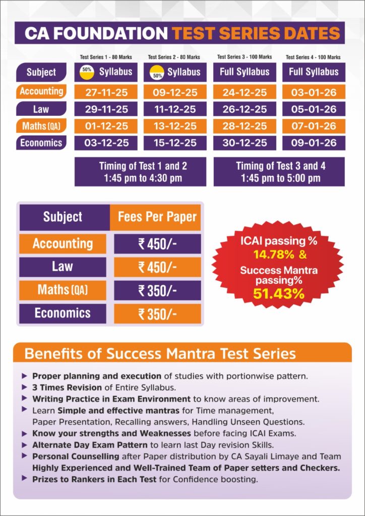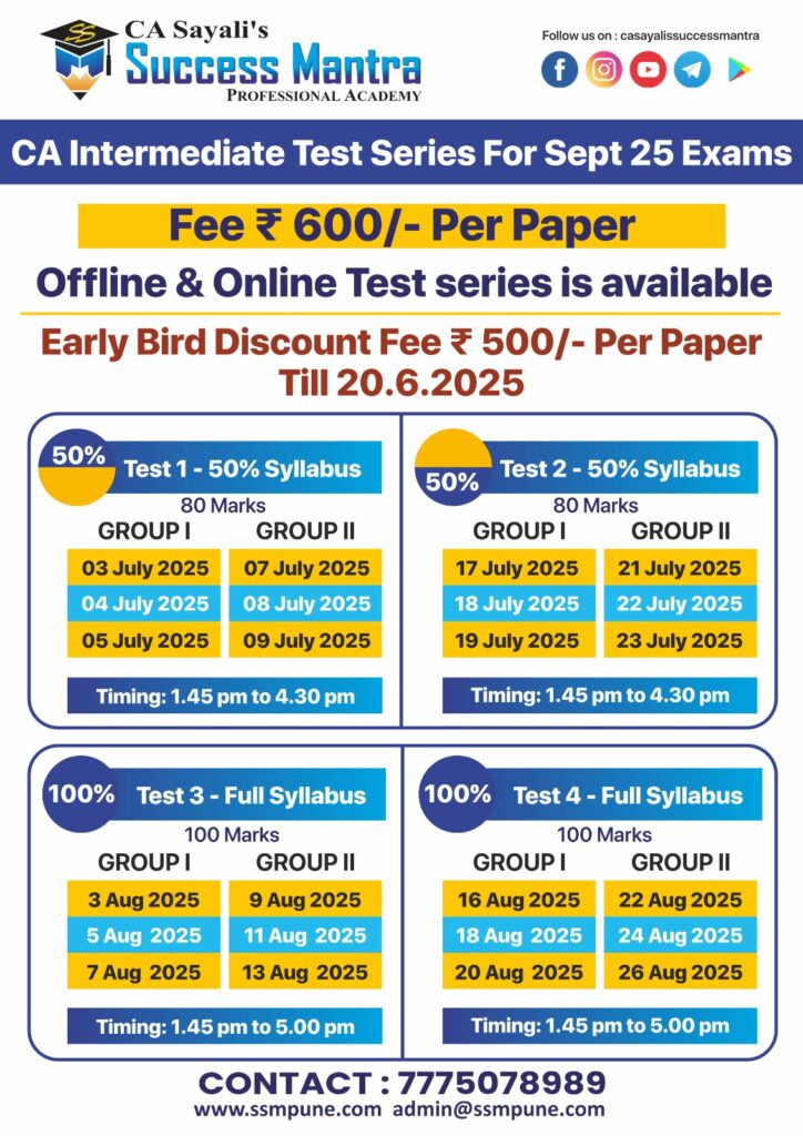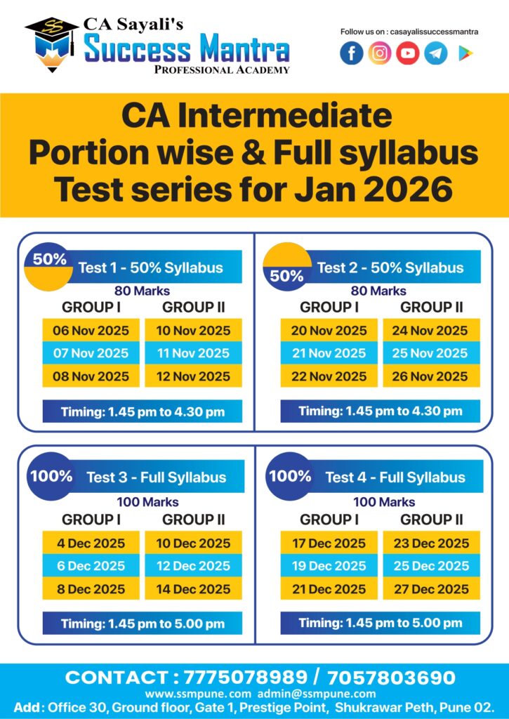 Success mantra's test series is exact 1st hand expirience of CA final exams. It helps to plan your studies in proper way,and checking of papers is also so proper so that you will get an idea where you stand before final exam itself. Also Sayali mam and other staff helps to resolve queries through whtsapp 😊 100% recommendable to go for these test series at any level of CA course.