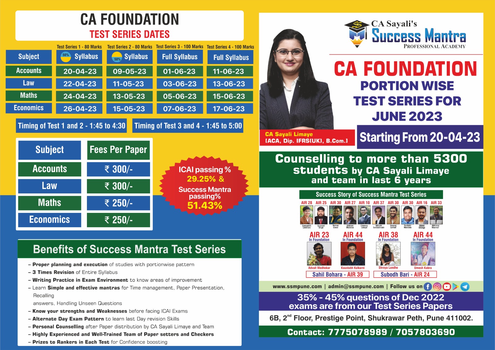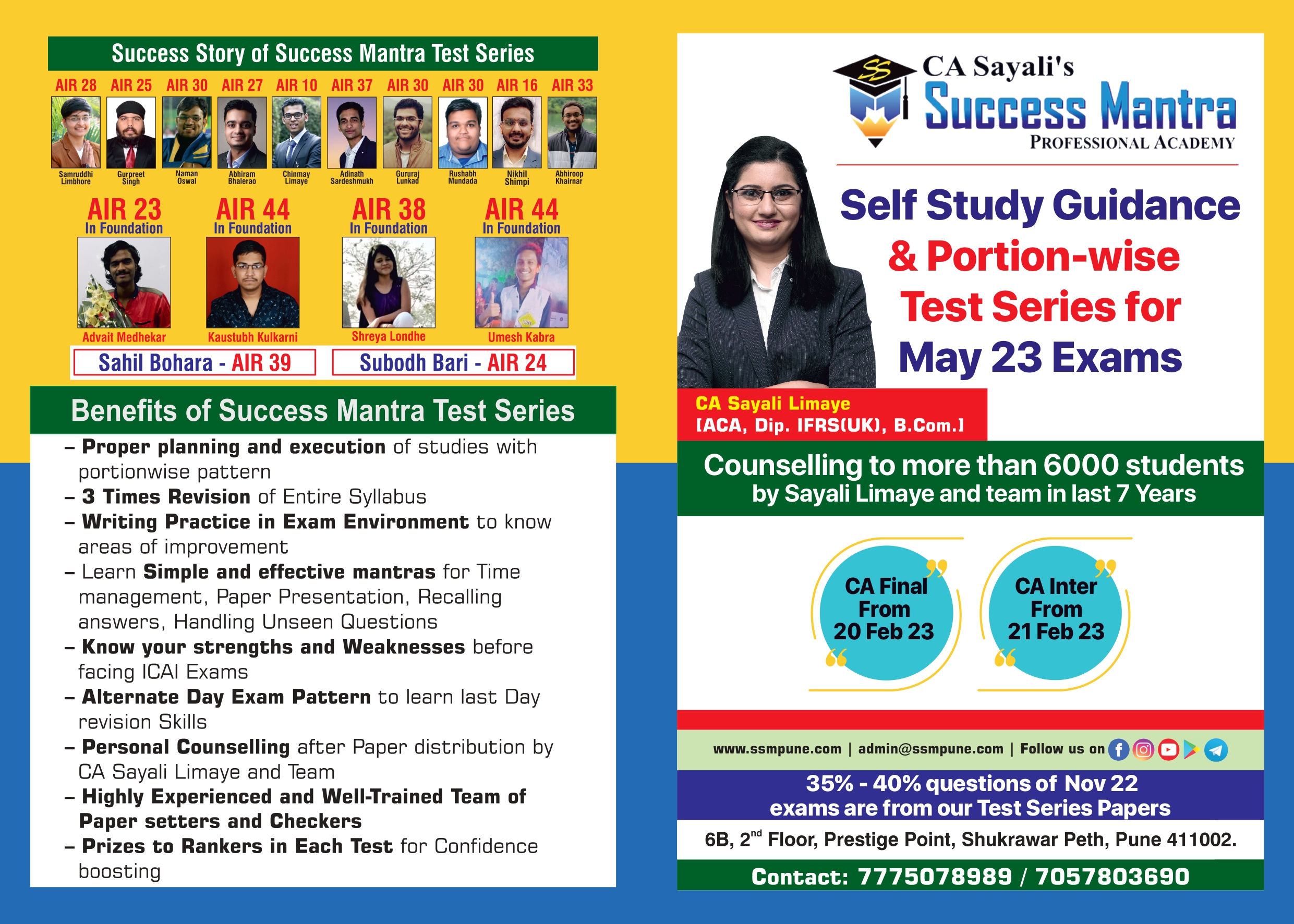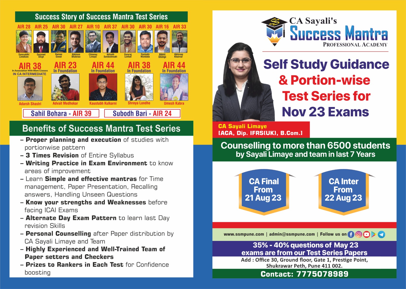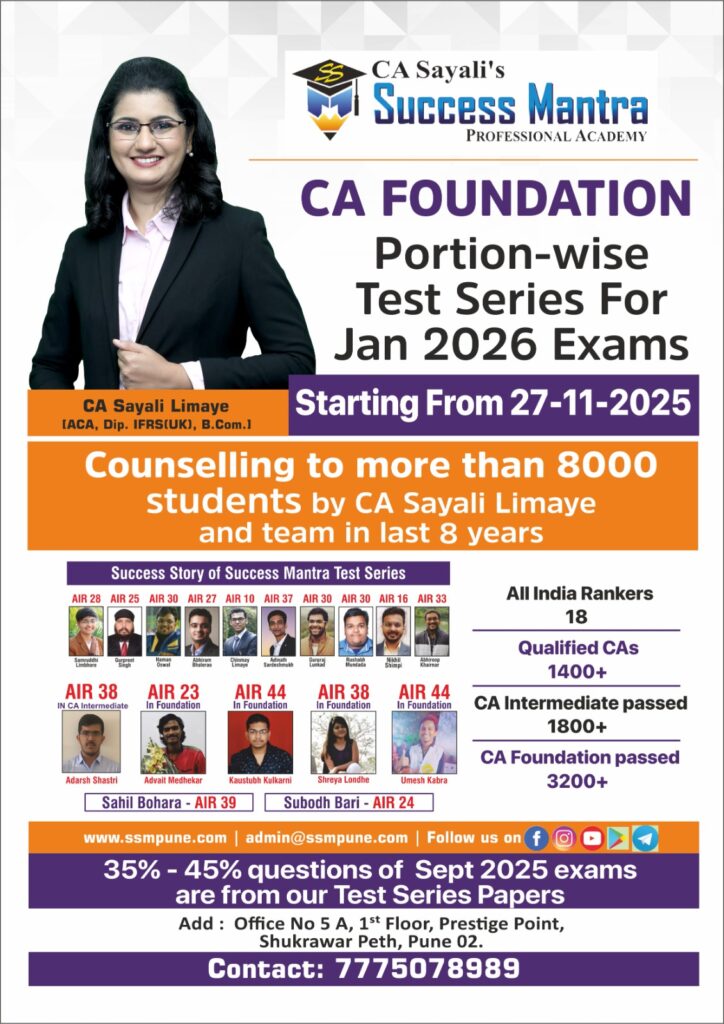 CA Sayali Limaye, a well-known mentor of Test Series across India, has expertise in conducting Self-Study planning seminars, personal counselling sessions and conducting Test Series for CA students. During the last 7 years of her experience, CA Sayali madam and her team members have guided more than 8000 students in their self-study planning.