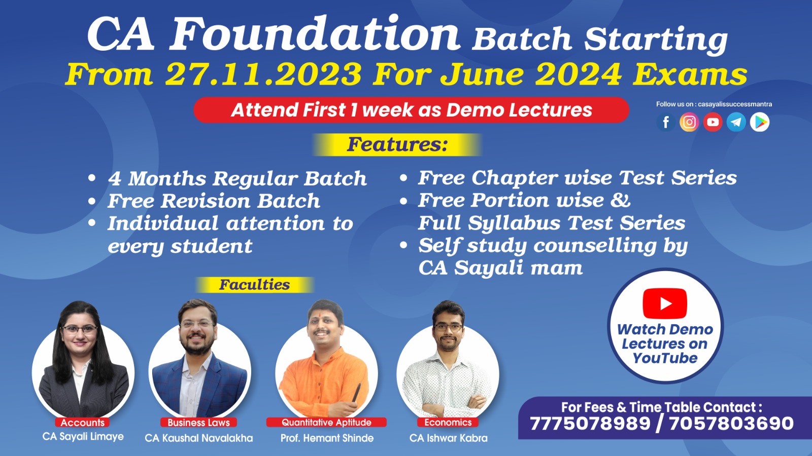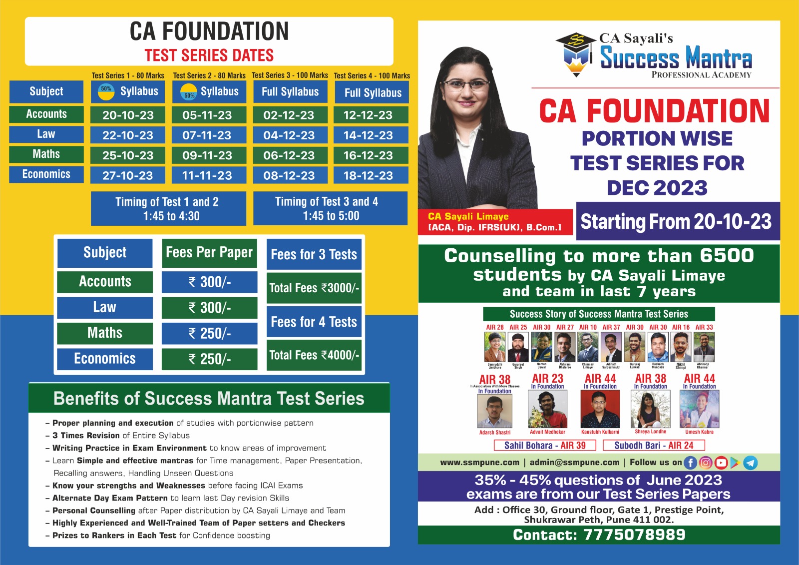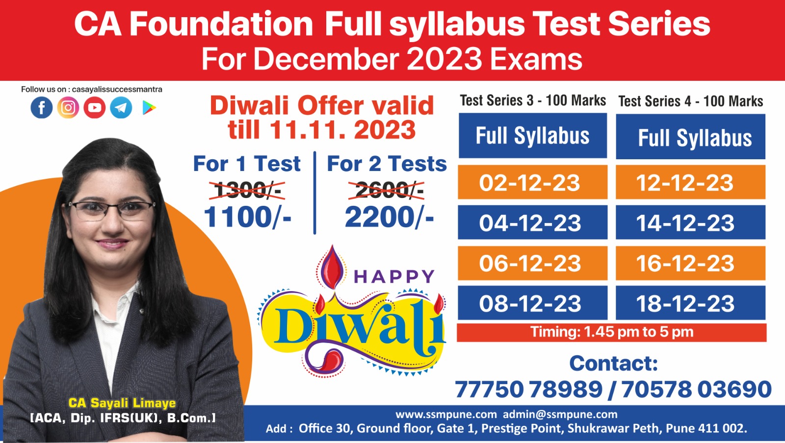 CA Sayali Limaye, a well-known mentor of Test Series across India, has expertise in conducting Self-Study planning seminars, personal counselling sessions and conducting Test Series for CA students. During the last 7 years of her experience, CA Sayali madam and her team members have guided more than 8000 students in their self-study planning.